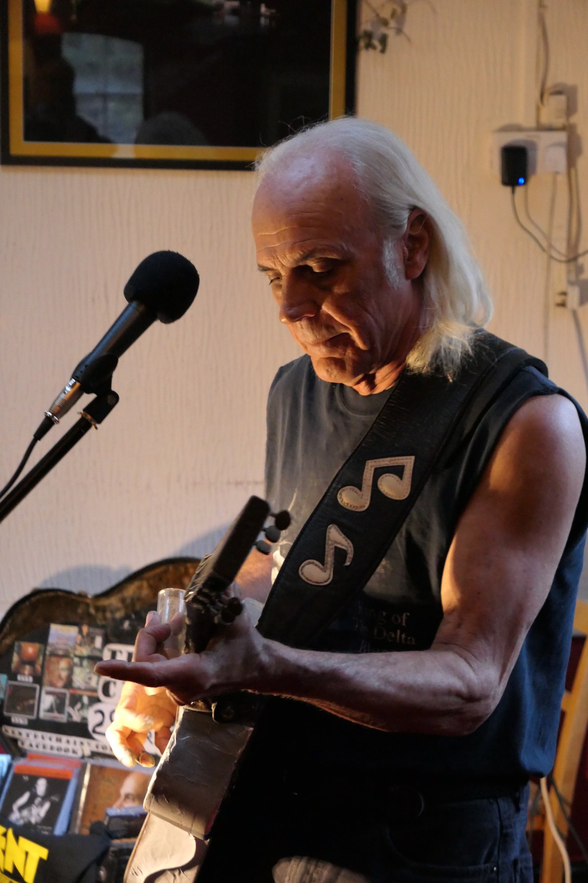 This Sunday last we were treated to a fabulous session from Kent Duchaine, a man described by Mike Harding as “a legend in his own lunchtime and a REAL bluesman”. I use the word “treat” advisedly, as the man turned out to be one helluva all-round entertainer. Not only did he play some wonderful stripped-back delta blues on his 1934 National Steel guitar Leadbessie, he also connected absolutely with his audience. Every break between songs, every intro, every outro, the man was talking, talking, talking about his life, his travels, his experiences, his deep love of the blues, the music he loved, the blues players he had met an known. And not without a good dose of self-deprecating humour. It was an education just listening to the man. Fascinating. And what a voice! The guy obviously gargles with lumps of granite in his throat! Whether talking or singing, to hear him, (and to look at him) I guess you’d say he’s “well lived-in”, and a well-travelled troubadour.