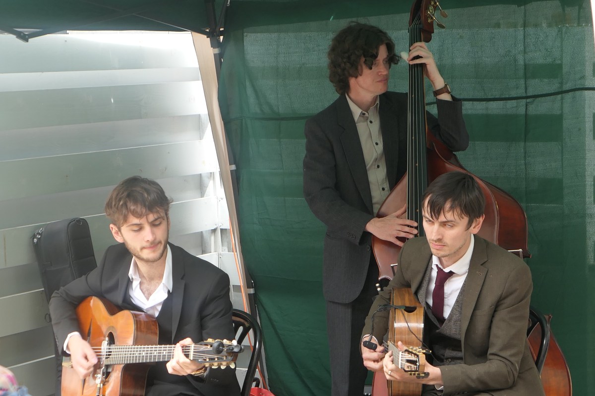 Anyhow, the music for today’s occasion was provided by a trio of instrumentalists (two guitars and double bass), three very relaxed guys knocking out some classic 1930s gypsy jazz tunes in the style of Django Reinhardt. This style of music was born in the pavement cafes of Paris, so I suppose a courtyard of a pub in Devizes is a pretty close match, right? Anyhow, the atmosphere was swinging and relaxed (chilled? yes- even in the welcome sunshine!). The packed crowd loved it, and even the (well-behaved) dogs were barking in appreciation. The wind occasionally tried to lift the small marquee, but no-one was going to let the elements spoil what was a thoroughly enjoyable afternoon.