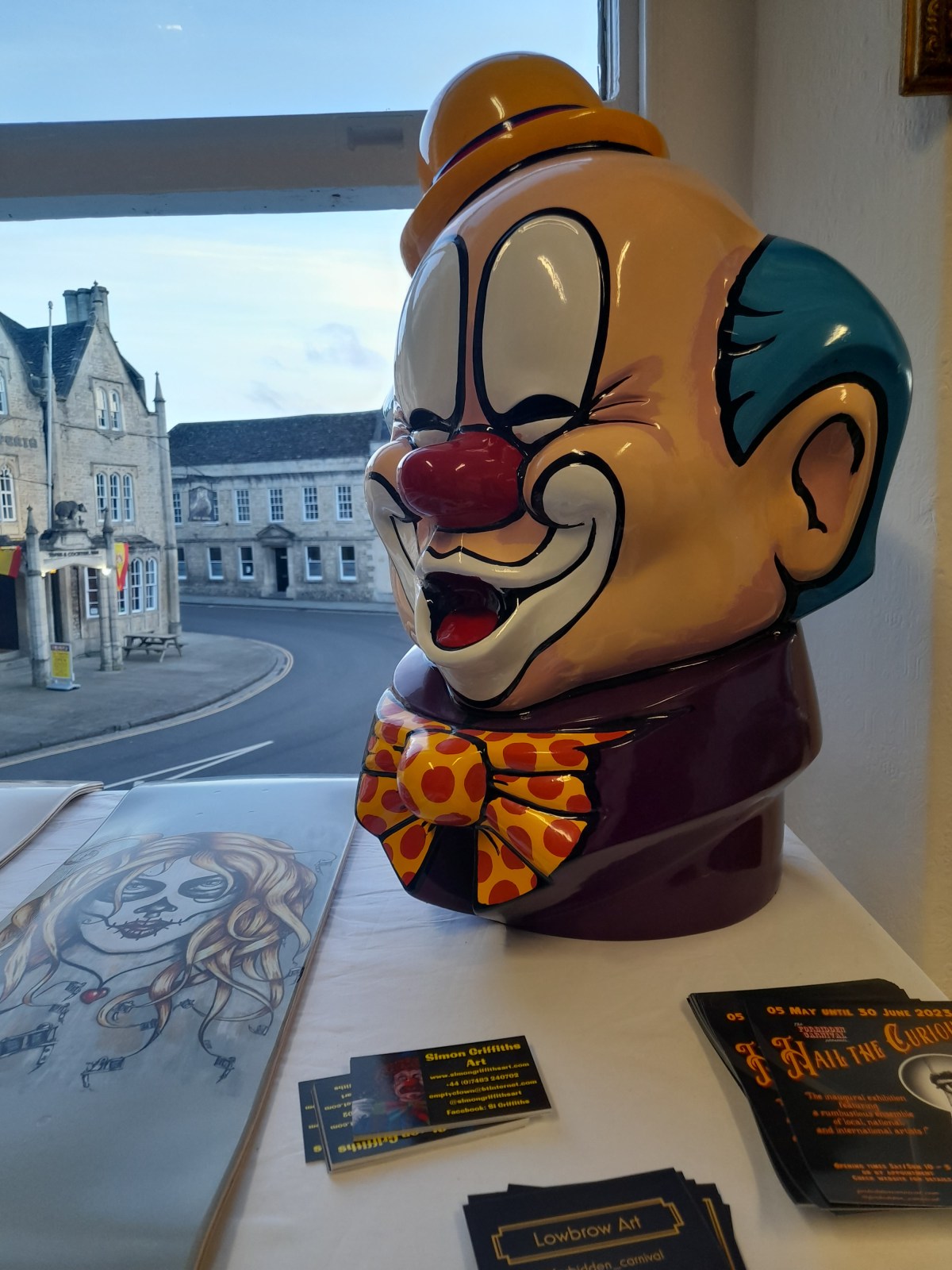 Alongside fellow artist Rae Melody from Chippenham, and dressed as a clown, Warminster artist Sarah Christie greets the curious and art lovers at the door of the newly opened Forbidden Carnival, long-time aspiration of homegrown Wiltshire alternative artist Si Griffiths. Inspiration strikes and she excitedly elucidates a blossoming idea on the topic of circus….. I went in, they had cake…...