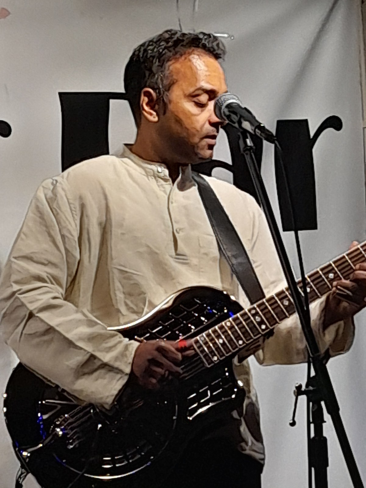 The performance, in a word, was sublime. With a rich voice, Ajay sure knows how to handle that guitar, and was joined by proficient tabla player, Vinod Kerai, injecting the Eastern influence into these devine self-penned songs. Geniusly awash with thought-provoking prose and backed with verbal explanations, the delivery reflected the skill of Paul Simon, archetypal blues subject matter, of life lessons, contemplating intrapersonal and relationships, yet subtly incorporating Hindu ideology, even mythology, and still reflecting more generally so all could relate. For example, Ajay not only had teaching of Itihasa and Vedas, but even contrasted the fable of Robert Johnson selling his soul to the devil at the crossroads with the order from chaos of Maa Saraswati, Hindu goddess of education, creativity, and music. This said, a majority of thought applied here was of his own observations and musings, which was earnest when it needed to be, and amusing equally.