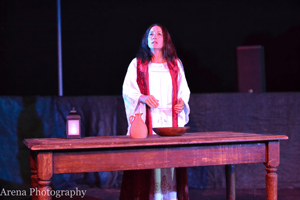 Our main man is superbly played by Laurie Parnell, brilliantly combining with Stephanie Richards as Lady Macbeth. The two of course see off Duncan, imperiously played by Gill Morrell. Faithful, then not so faithful thanes are provided by Simon Reeves as Lennox, Taruna Nalini as Ross, Bryce Collishaw as Monteith and Graham Paton as Caithness, aided and abetted by Josh Phillips as Macduff, and Francis Holmes as old Angus. Somebody has to do all the sundry stabbing and Ian Diddams as Seyton and Bryce Collishaw as accompanying ne’er do well provide the means to a sticky end seeing off Oli Beech as Banquo, Charlie Aldred as Young Macduff and Kerensa McCondach as Lady Macduff. Centre stage of proceedings of course are three witches… suitably manically presented by Phoebe Fung, Penny Clegg and Andy Cork. Gentlewoman Lydia Harman-Verrell and Doctor Roger Hames provide for Lady Macbeth’s wellbeing, and it’s all mopped up in time for Sarah Horrex as Malcolm to finish it all of with a rousing speech… though Fleance – Charlie Aldred again – is never far away… Its not all darkness, blood and tragedy of course – Graham Paton wades in with some welcome comic relief and the obligatory Shakespearian knob-gags as the philosophical and equivocating Porter.
