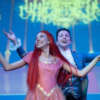 She was superbly accompanied by the dynamic duo of Frankie Walker and Daisy Woodruffe as Flotsam and jetsam, Ursula’s henchmen eels who worked really well together. Ariel was the archetypal Disney princess portrayed to a tee by Katy Pattinson – gorgeous and tiny, with such a pretty voice and moved about the stage nicely. Her chemistry with Eric was particularly good, and as a pair the complemented each other well. Her Act two performance in particular as a mute was really well executed with some strong physical acting, communicating superbly with facial expressions. Her scene of learning to walk was choreographed and performed extremely well.