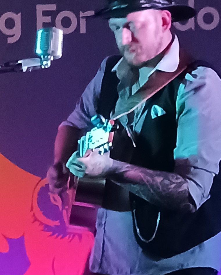 So step into the limelight Josh aka J.P. Oldfield dead on time, guitar in hand, standard waist-coated, open shirt and hat attired. And it was hot. Very hot. And he did perspire with much dampness with no towel, having rejected the advice from his fellow troubadour. And it was sweaty.