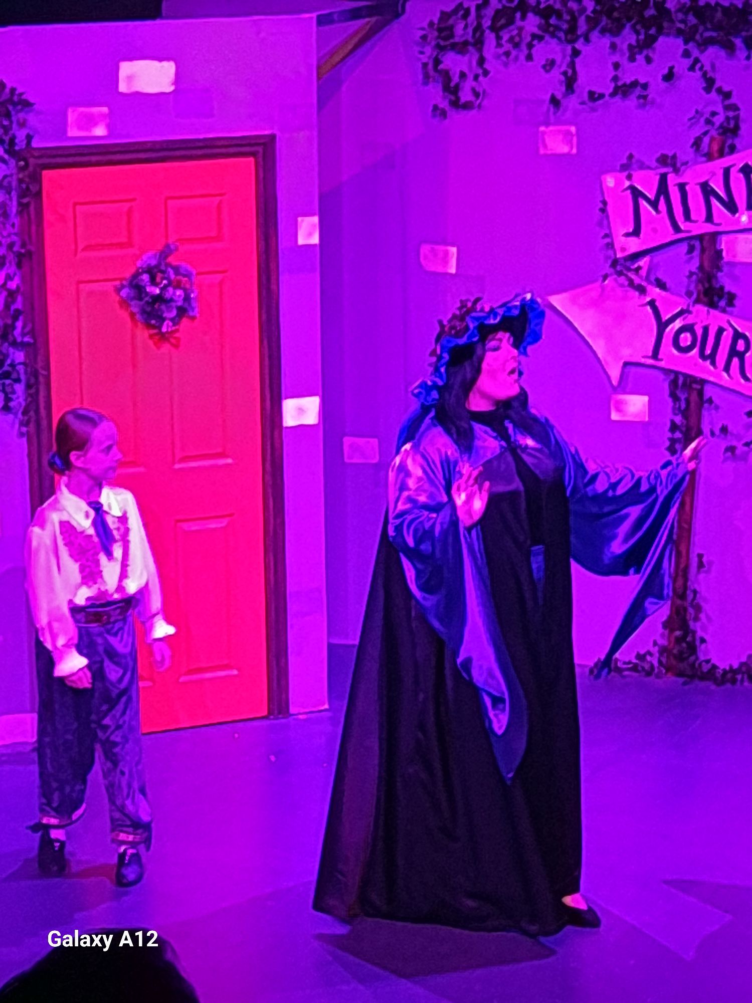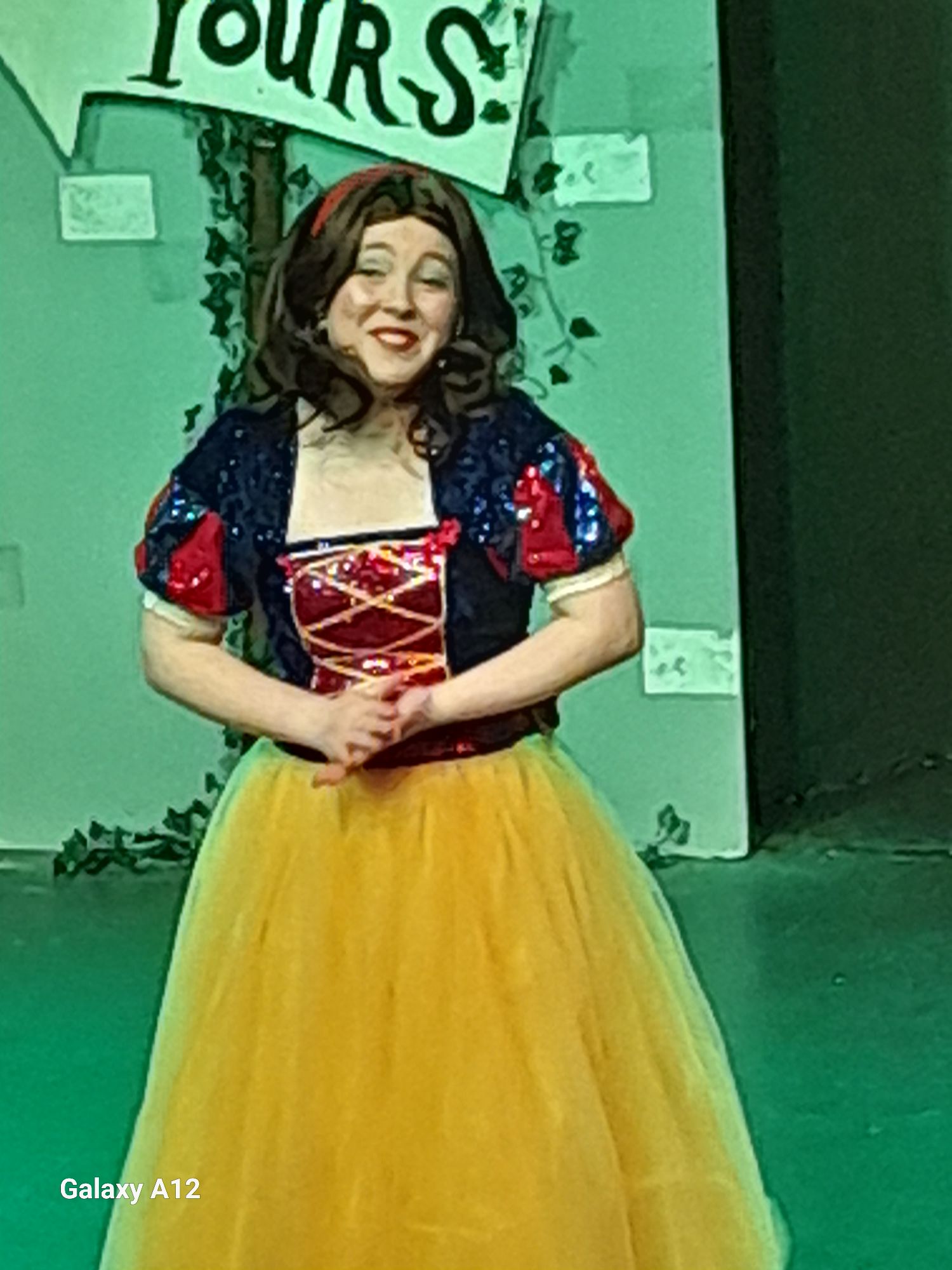 Helen plays the face of the magic mirror, brutally honest yet cheeky with the Evil Queen, played with passion and skill by Georgina Watson, from PVADS and who undoubtedly performs the best solo. Yet a truly magnificent antagonist is never a thing without a trusty sidekick, and, no stranger to the Wharf and Stagecoach, twelve-year-old Gigi Underwood takes that role superbly.