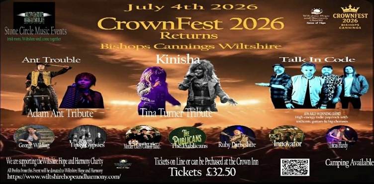 Stone Circle Music Events announced today that all proceeds of CrownFest will be donated to Wiltshire Hope & Harmony’s Dementia Choir. CrownFest is an all-day family festival, happening on 4th July 2026 at The Crown, Bishops Cannings, Devizes…..