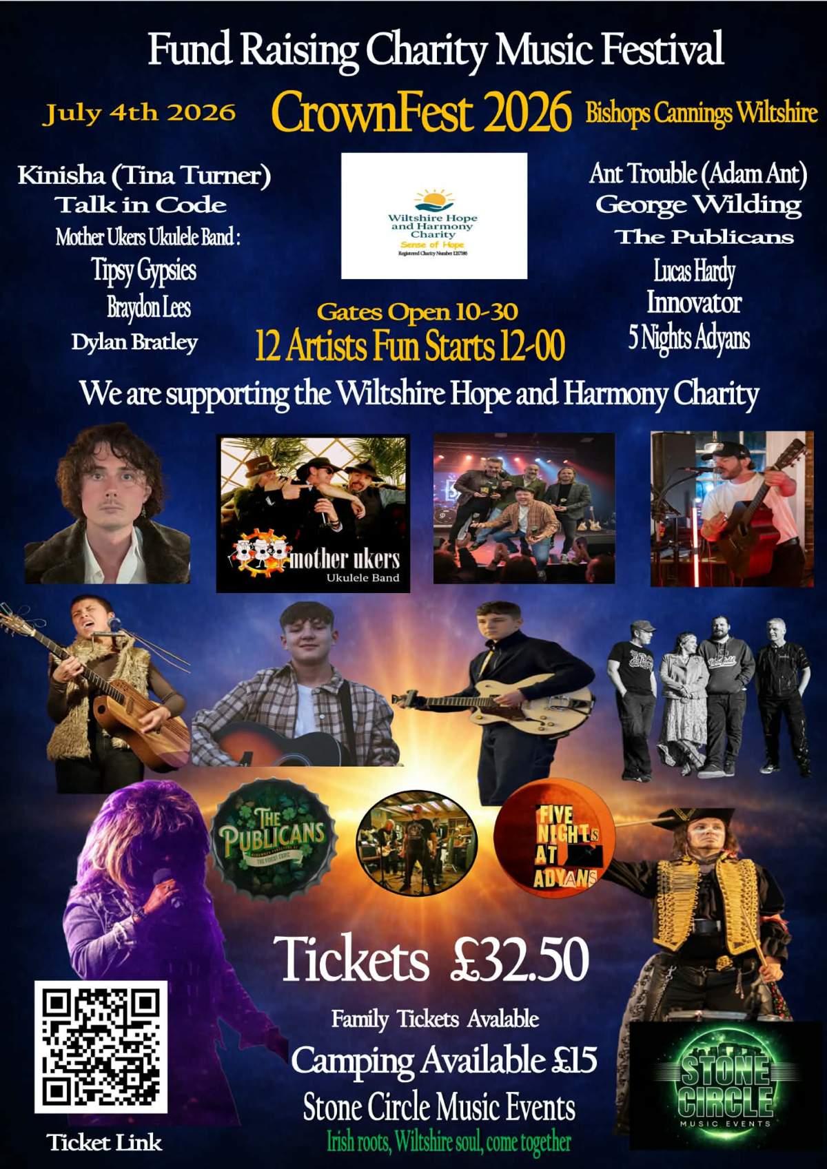 So, what I’ve already told you: Kinisha’s renowned Simply the Best Tina Turner Tribute and Adam & The Ants tribute Ant Trouble headline, closely followed by Wiltshire’s premier indie-pop favourites and winners of six Wiltshire Music Awards, Talk in Code. Purveyors of Irish & Celtic folk The Publicans will also be playing, along with Salisbury’s rock cover band Innovator, rock covers band Tipsy Gypsies, the one and only George Wilding, Mother Ukes, and the blooming marvelous Lucas Hardy.