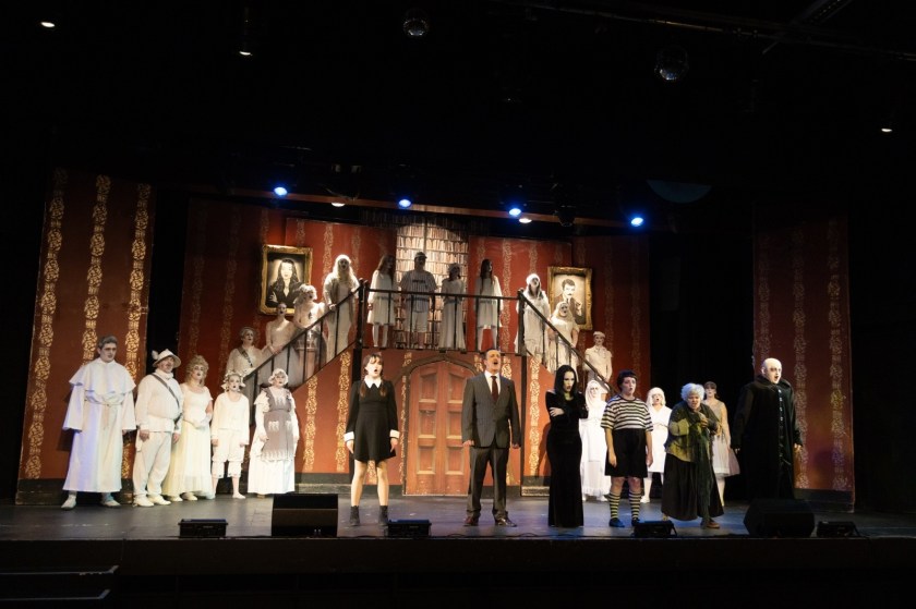 Attending a dress rehearsal has slight differences to the actual show, one thing you wouldnโt see at the show was when, at the interval, Ben Griffiths-Mills, who plays the disturbingly innocent Uncle Fester, came to address the director Lyn Taylor, who happened to be sitting beside me. The Addams Family is more music and fun than spooky, the most shocking part of my evening was not in the show, rather when Ben spoke in his normal voice to Lyn, as I was so utterly convinced by his sublime performance as Fester, I expected him to speak with the quirky high-pitched accent of Fester! And this sums the experience up, so credible it is, I had to remind myself these were actors in character; in that, Thing wasn’t wandering around the school at night, and if forced to pick a favourite, Uncle Ben Fester would probably be it!