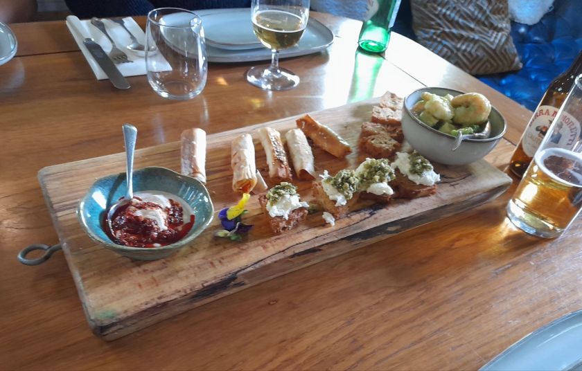 Drinks are served, and you are not rushed here. It’s all finest ingredients, homemade and using local produce, which they proudly transform into tapas-style plates that celebrate sharing and connection. A grazing board, chockfull of dips and tapenade arrived, with pesto topped crostini, charcuterie skewers antipastisti with melon, avocado & prawns, Moroccan carrot puff pastry with orange and thyme syrup, and harissa tahini yoghurt, and, and, oh, look I’m no Jay Rayner, don’t even sport a goatee, I’m only now aware how my tastebuds will love me forevermore!
