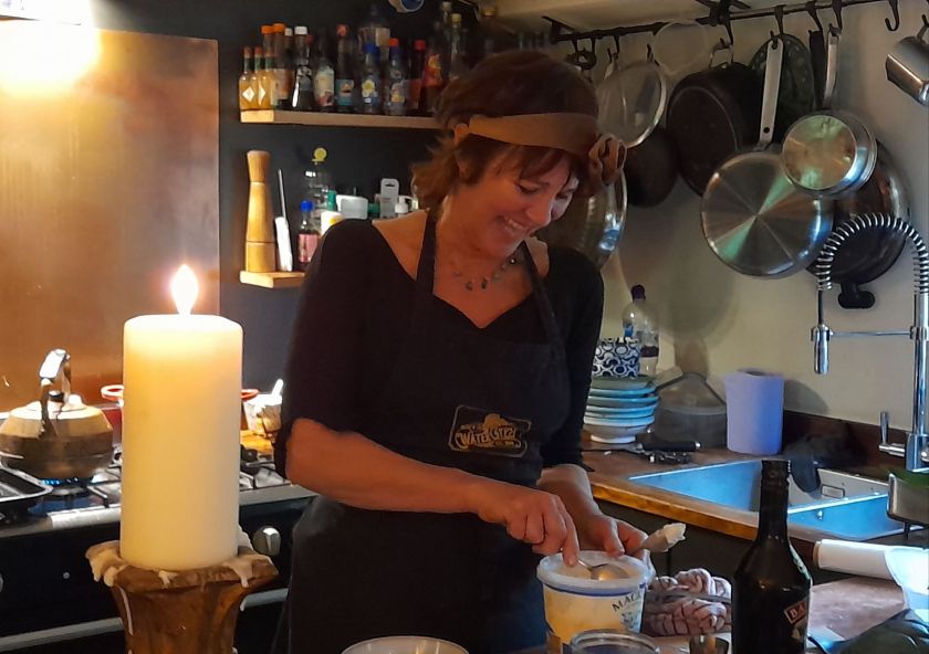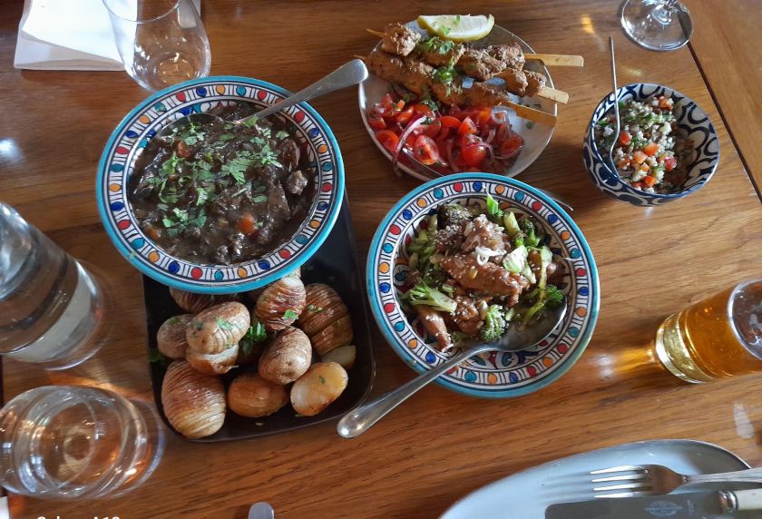Pescatarian and vegan are catered for, but our main courses were beef estofado, a scrummy slow-cooked Peruvian stew, and delicately sliced hasselback potatoes, sticky pork glazed in garlic and ginger, with spicy Asian broccoli, and chicken tikka skewers with tomato salad….need I say more for clues to the way to my heart? Food heaven in gypsy ornamentation charm, canalside!