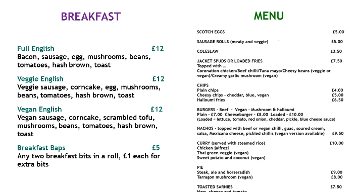 Food is provided by the fantastic festival feeders Events Horizon with breakfast and all-day menus with snacks and spuds, chips, burgers, nachos, curry, pies and toasted sandwiches, with carnivore, vegetarian and vegan options amongst those.