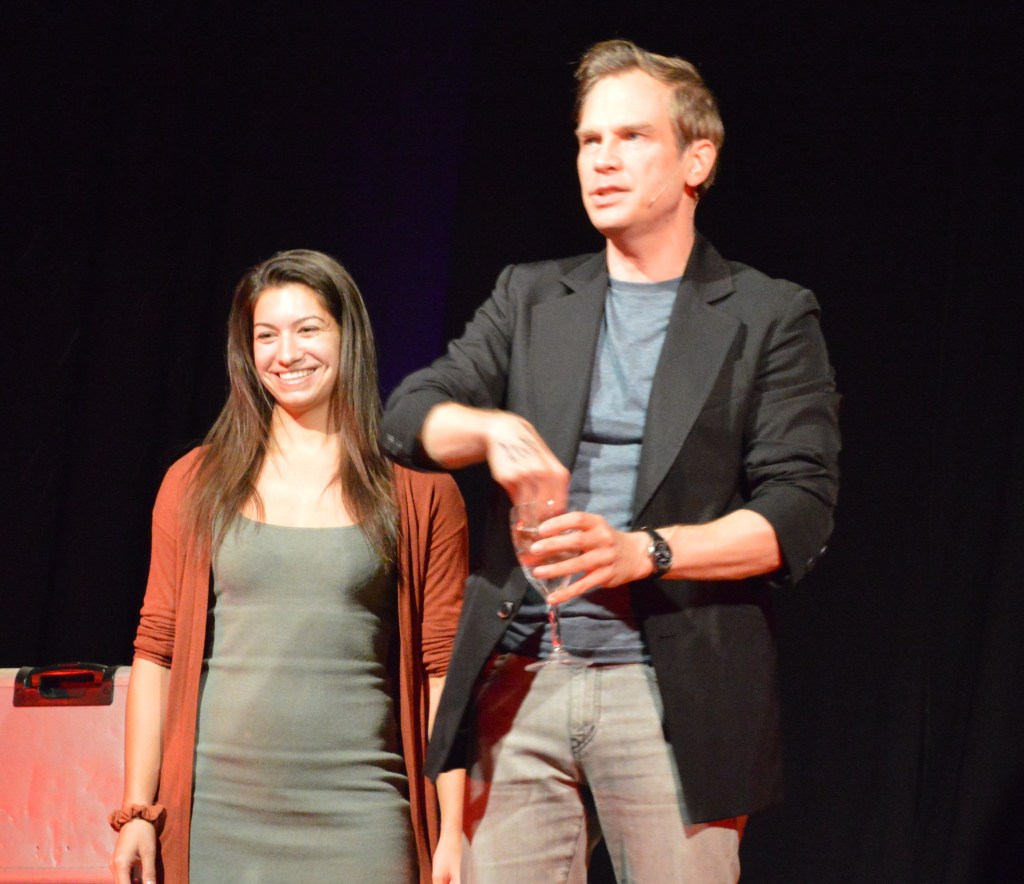 Following the half-time scrums at the bar, and the queues for the loos, the second half offered up a couple more comics.ย First of these was Ali Cook, another very experienced performer in terms of TV work, Edinburgh Festival and the corporate circuit. Ali combined his comedic patter with a number of sleight-of-hand magic tricks, effortlessly pulling victims (sorry โ โassistantsโ) out of the crowd to help him on stage.ย Routines involved card-tricks, apparently eating goldfish, and smashing an i-Phone to pieces.ย Another clear hit with the crowd.
