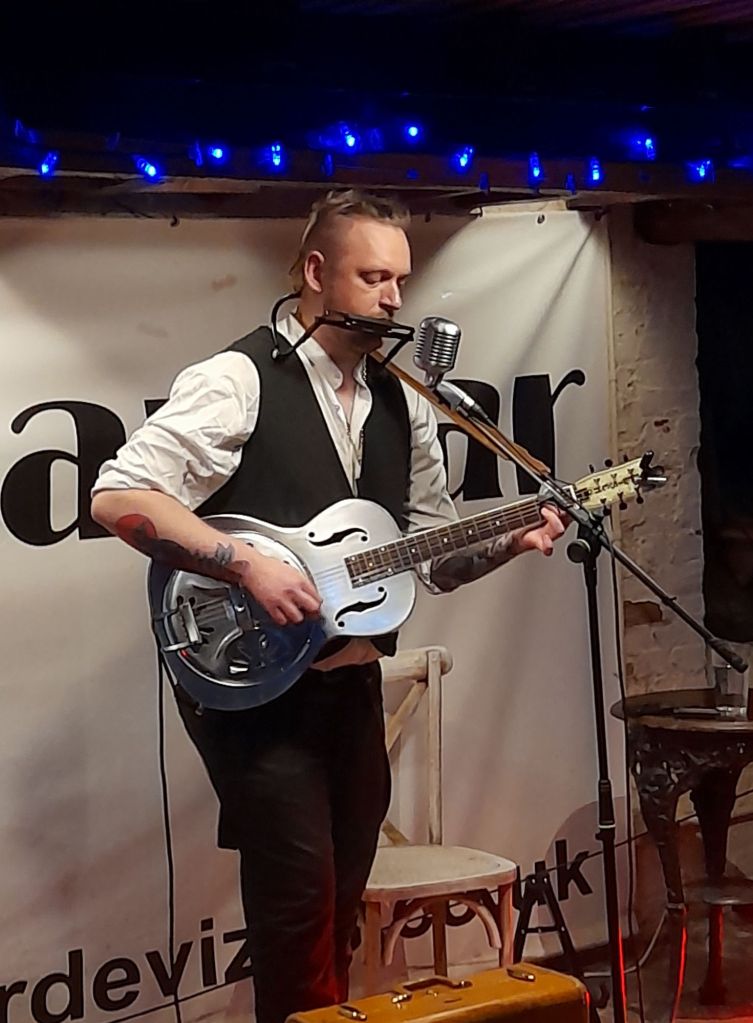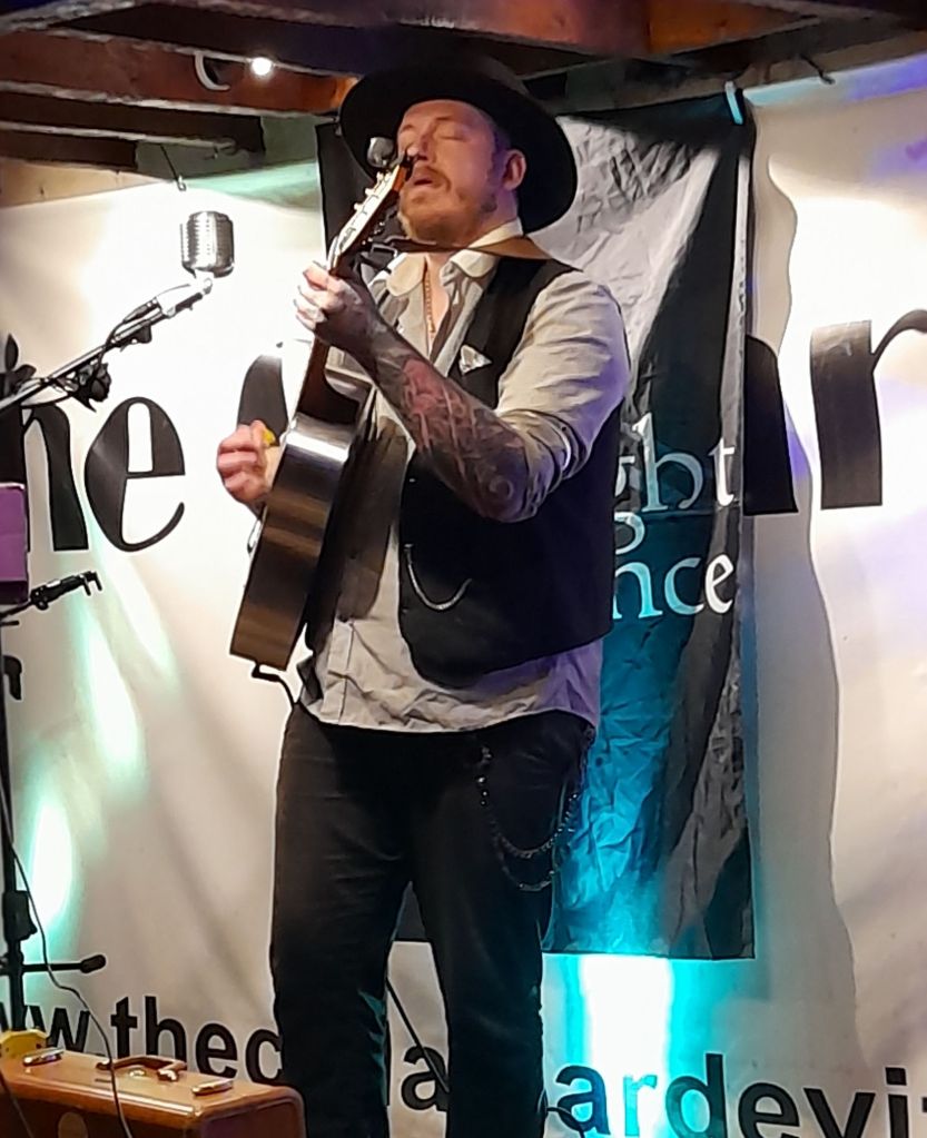 I mean, Devizes own contemporary blues throwback, JP is getting bookings, and rightly so. He’s off to Trowbridgeโs Lamb next Saturday for a double-bill with Joe Burke. Likewise our favourite Goth duo Deadlight Dance too, Tim showing me some fetching snaps from Friday night’s gig at Frome’s Tree House. But sometimes it’s nice to play an intimate home gig you DIY, so we’re down The Bear Hotel’s Cellar Bar, reviving a once beloved venue with alternative options to Devizesโ status quoโฆ..