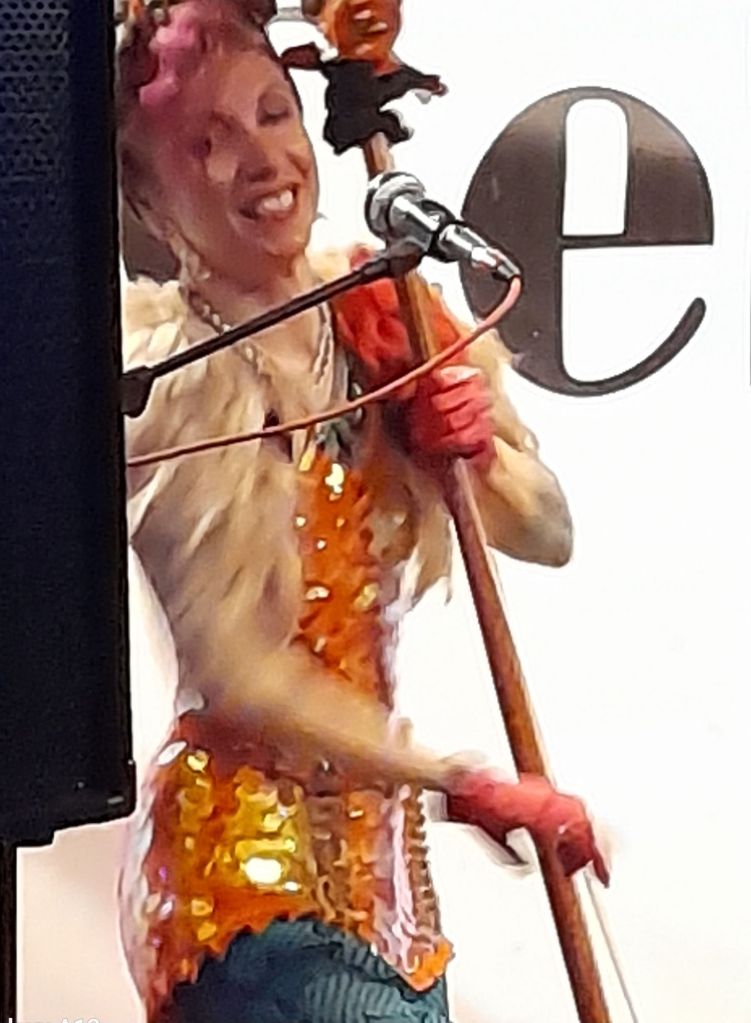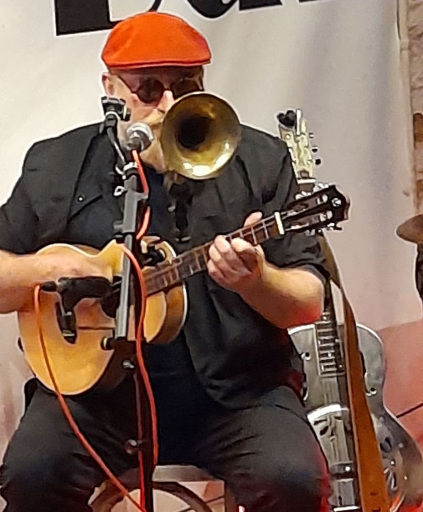 Being he was unaware of them at the time, I assured Josh he was in apt company. For if JP’s style is quirky, Nipper, a freewheeling James Baskett/George Formby crossover, and Jellylegs Johnson in sequined hot pants, feathered flapper girl headband and marigolds, audaciously but not impudently salvage long-lost rags, nuggets of bebop and gypsy jazz with tenor ukuleles, a kazzumpet, and Jellylegs on a bass handmade from a washtub and broom handleโฆ and that’s beyond averagely quirky!