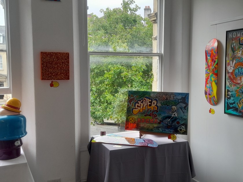 For a taste of something different this exhibit is still worth your while, there’s some amazing pieces on show here. Artists Rae Melody, Sarah Christie and of course Si himself contribute some zany compositions in their own style, some of which are printed, some of which are hand-painted onto skateboards for purchase. Not for me, with no sense of balance, but I would undoubtedly have the coolest board around!